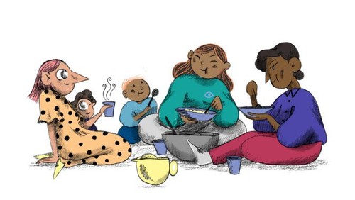 Fortælling med sang og musik, fællesspisning og sjove aktiviteter for børnefamilier.